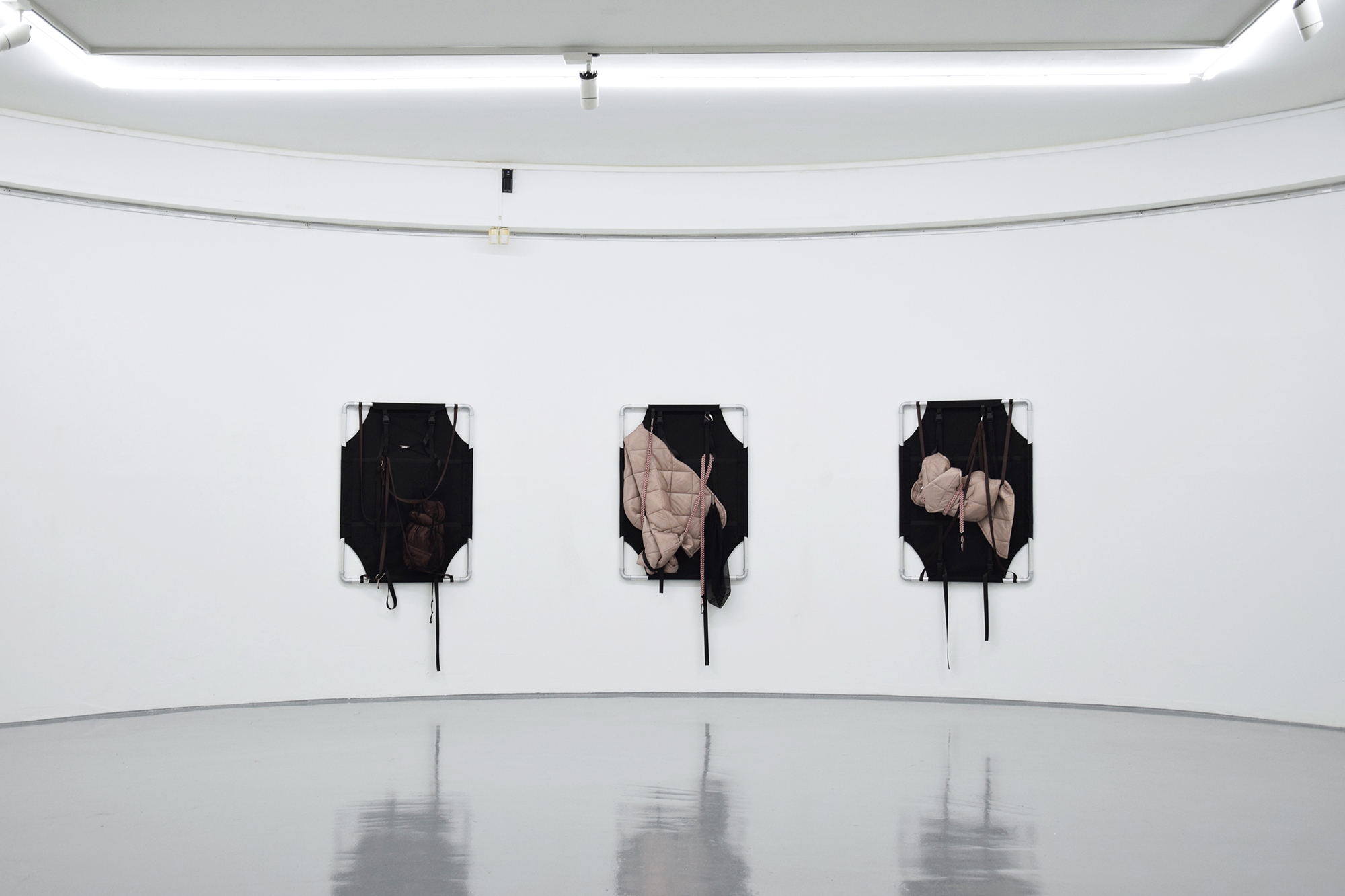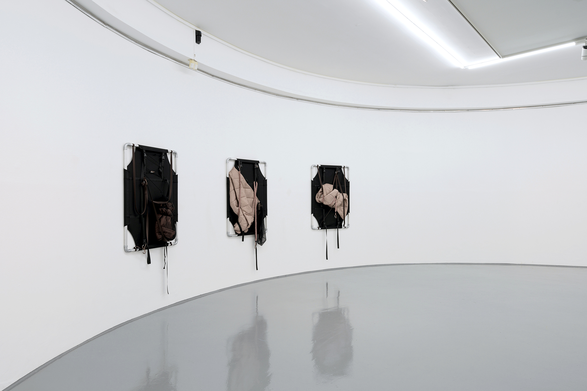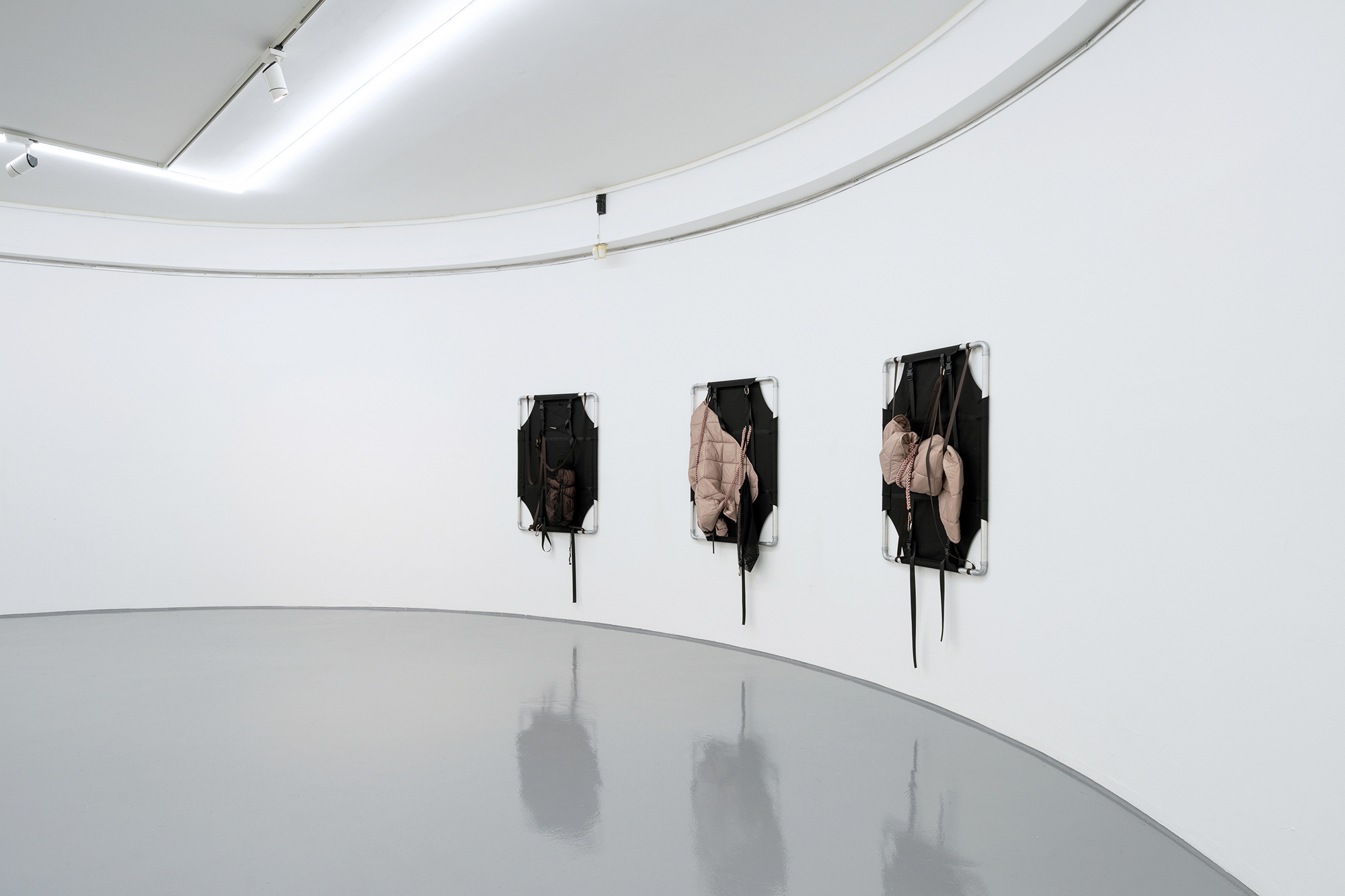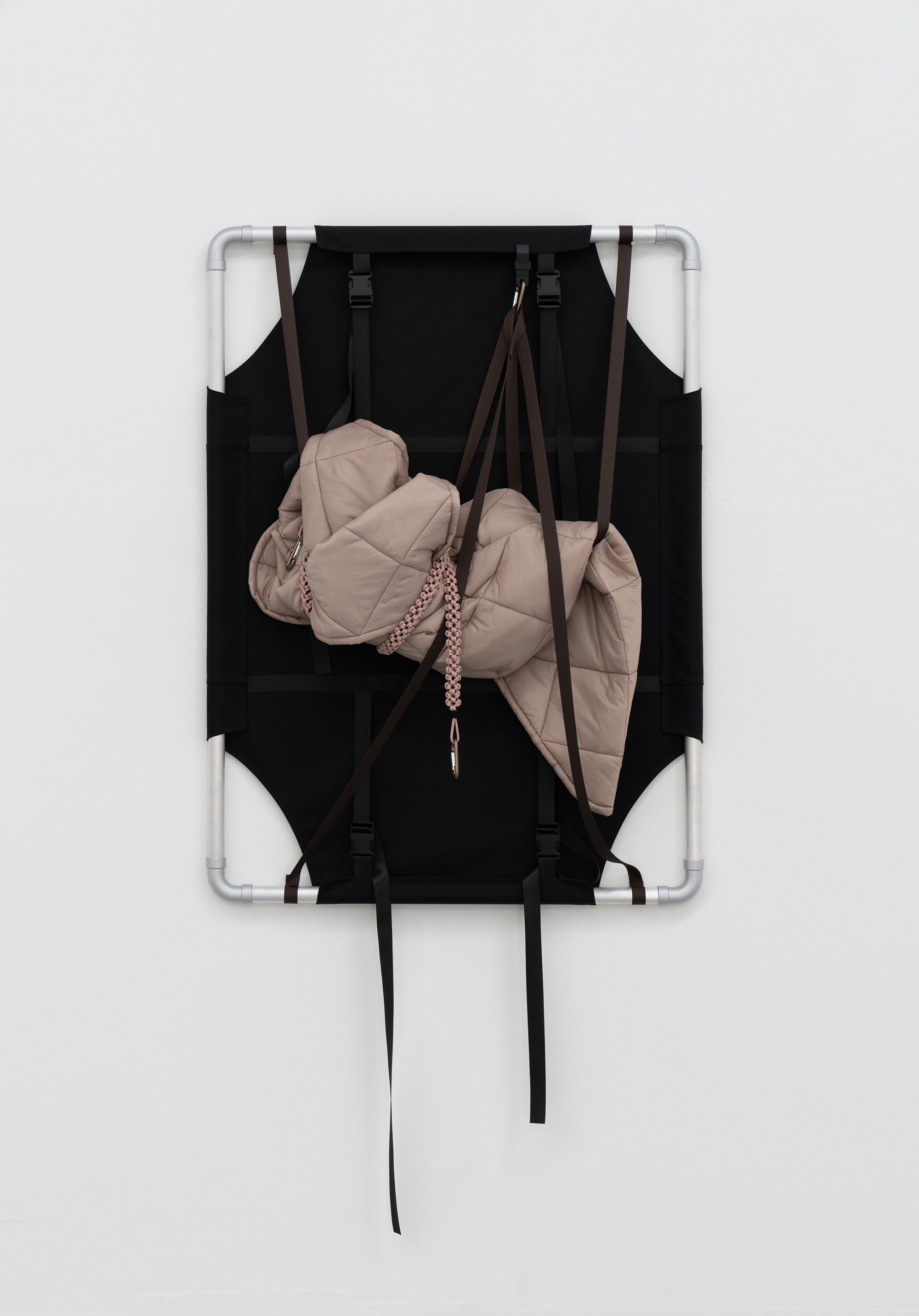Through her work, Skensved frequently explores the ways that social exchange and interdependence are necessary for human survival. She employs the formats of “outdoor” or “adventure” gear because of the way that the objects relate to the body in their scale, shape, or intended purpose. In her installations, she often arranges objects (like sleeping bags or camping stools) into groups or pairs, imagining them as stand-ins for bodies, in order to represent a social gathering or an exchange between people.