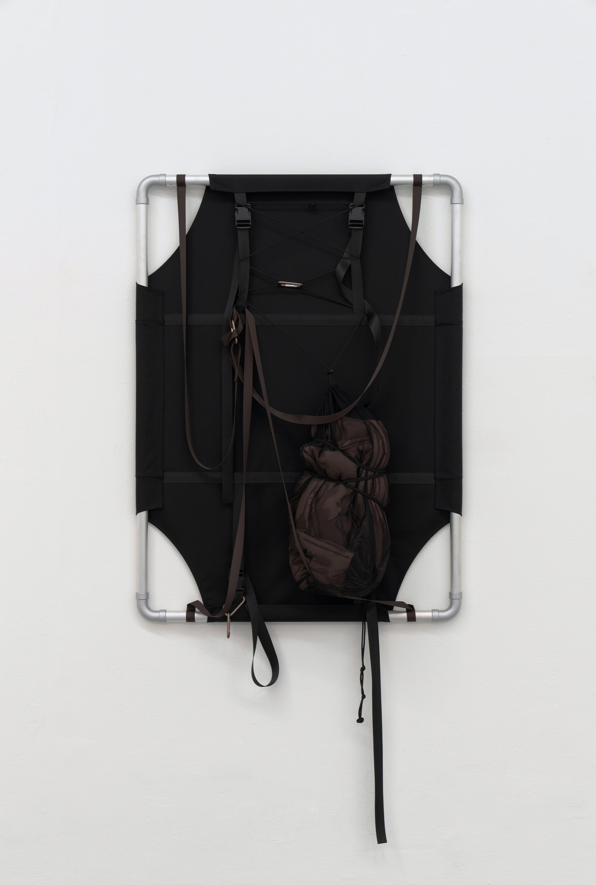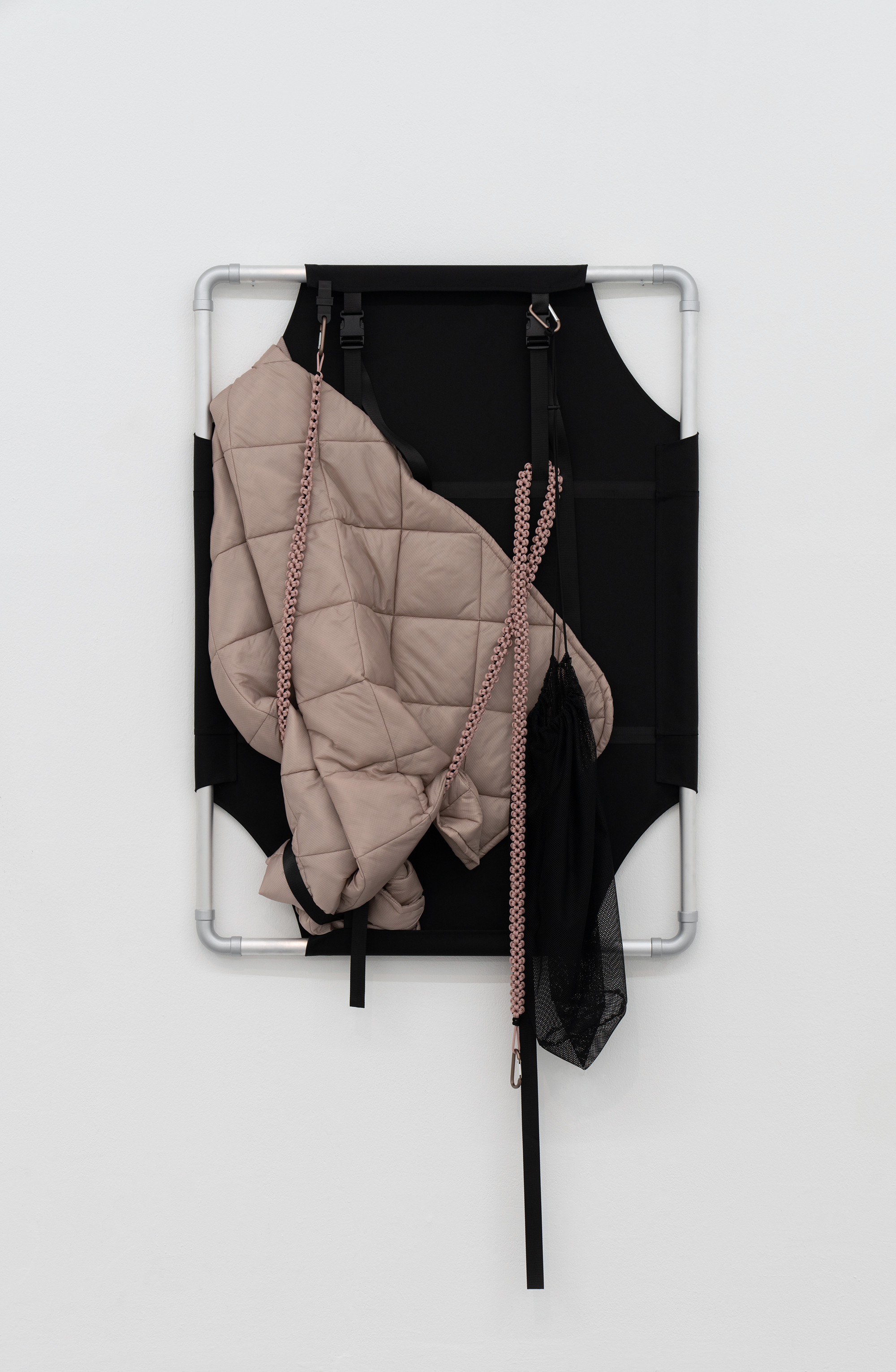 Aluminium frames, nylon, polyester sports mesh, polyester filling, thread, rope, nylon straps, buckles, and carabiners