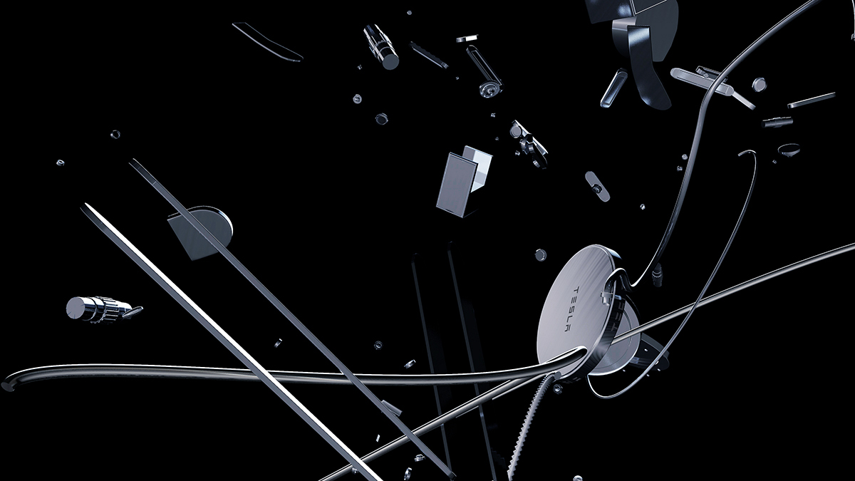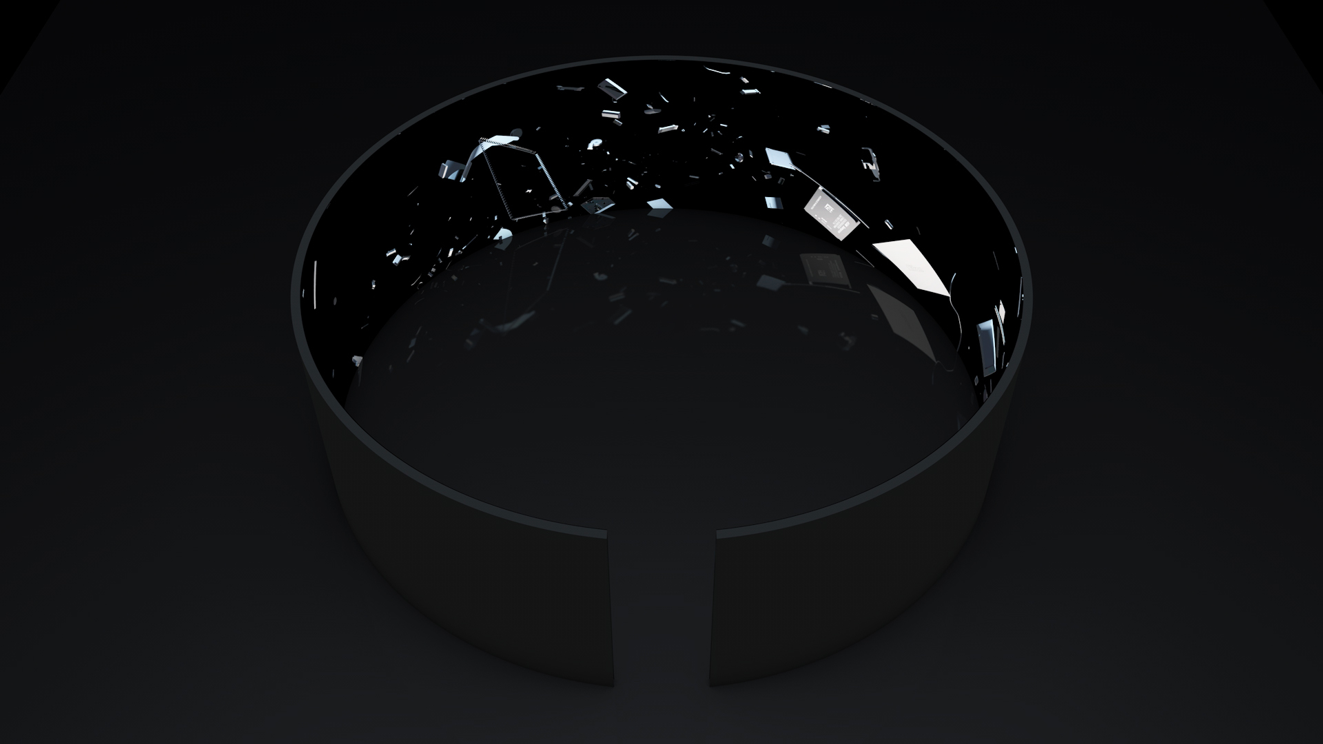 The visuals in TERATEAR consist of a single scene — a 360-degree fly-through a cloud of technological debris suspended in a dark, zero-gravity void. Although the scene suggests the aftermath of a violent explosion, wherein metal fragments were jettisoned into deep space, the objects themselves remain in 'mint condition', their glistening chrome surfaces completely unscathed. These sleek, branded objects spin weightlessly against a black backdrop, their setting reminiscent of advertisements used to sell personal electronic devices. The scene is situated in an ambiguous realm between a commodity-fetishising smartphone ad and a post-apocalyptic disaster scenario.
