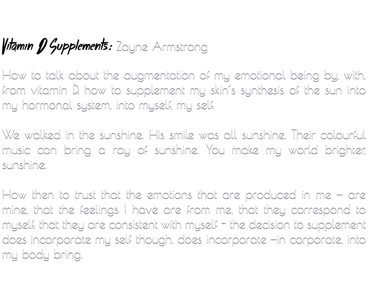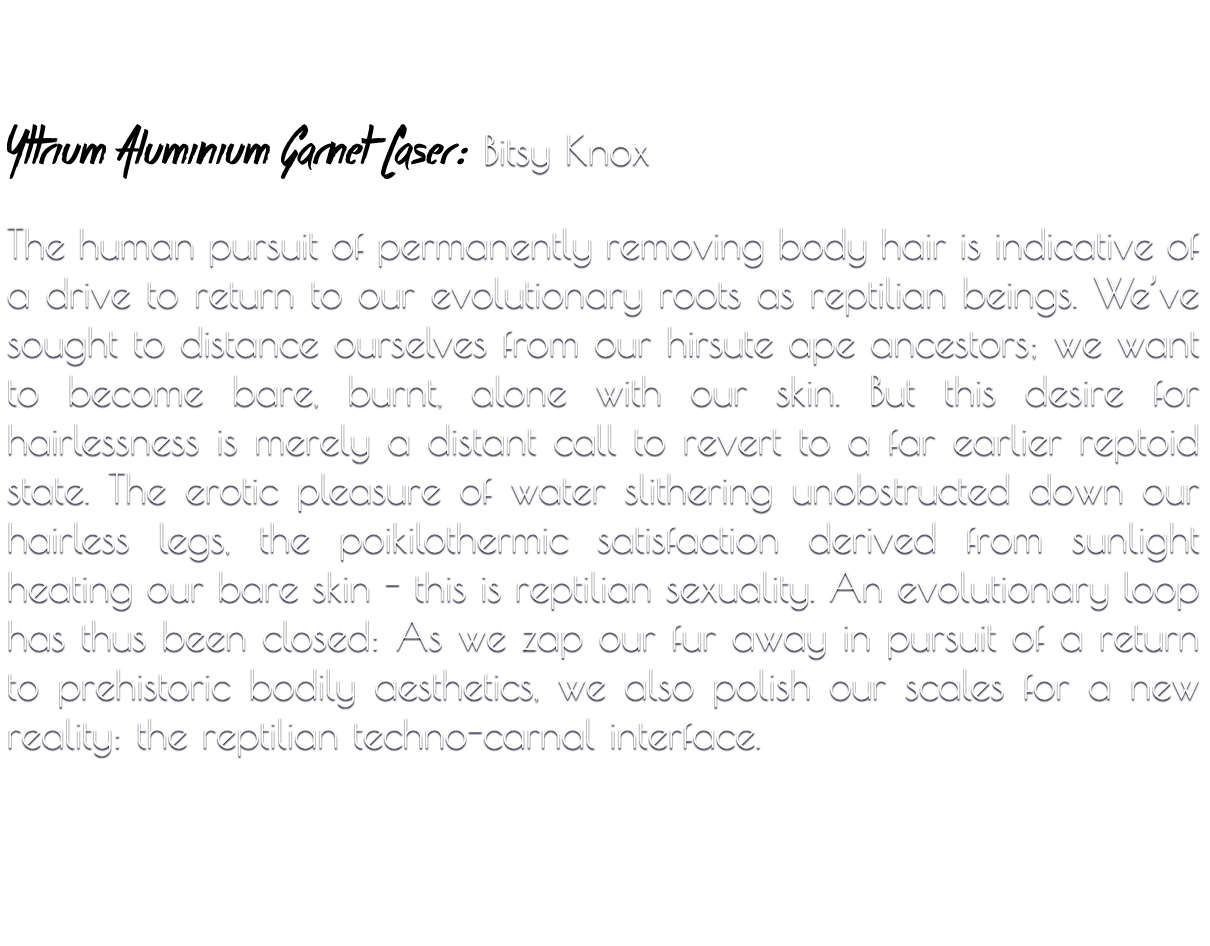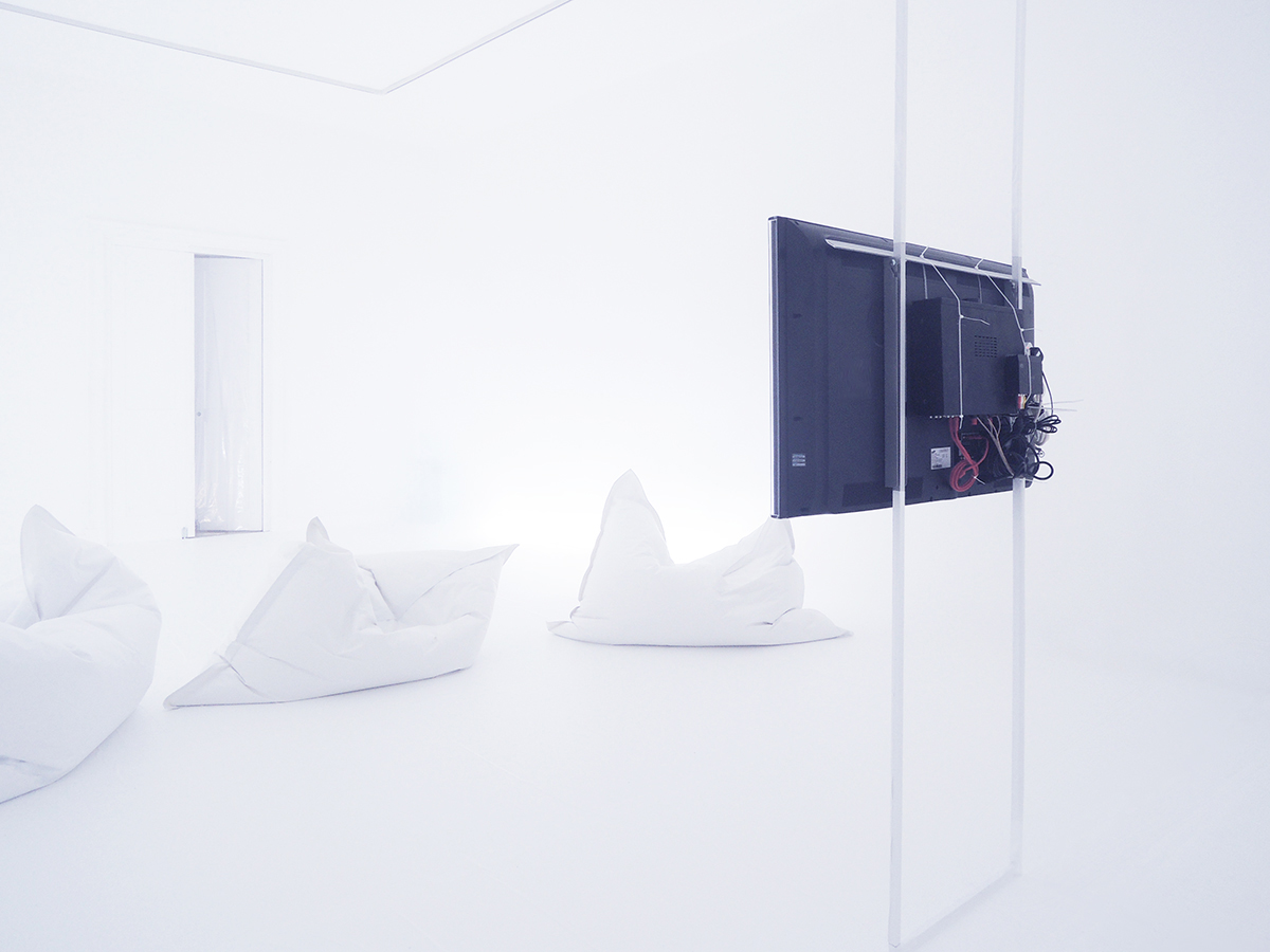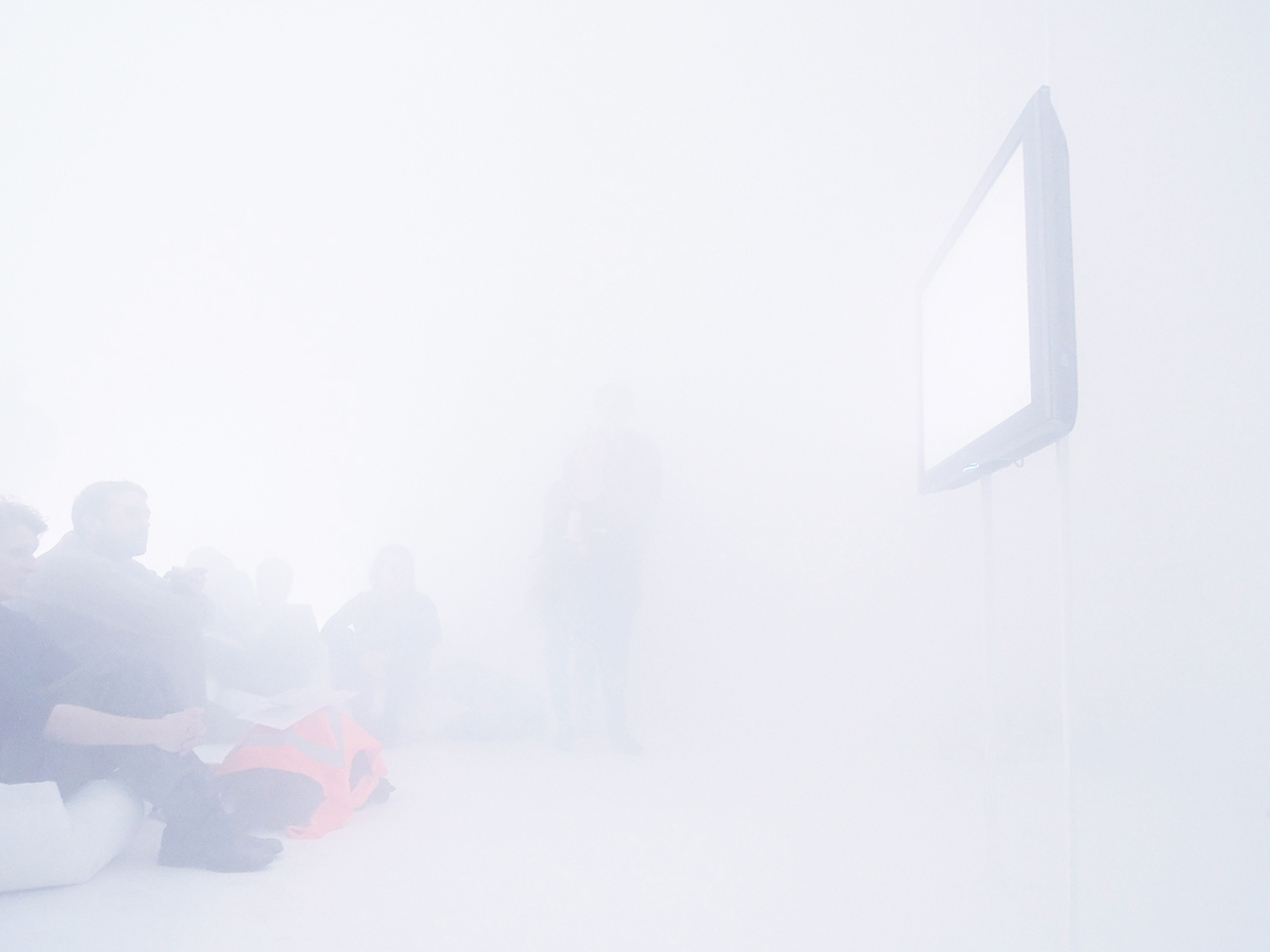 eStamina delves into the perceived possibilities of ‘human enhancement’ through technological means. The centrepiece of the show, a 60-minute ambient audio track accompanied by cg visuals in a drugged fog, involves scripted contributions from 26 others, including artists, musicians, curators and a neuroscientist. In compiling these varied accounts, a futuristic dreamscape emerges – a projection of anxieties and desires driven by the hyper-emotionalized and aestheticized ideals of the commercial sphere.