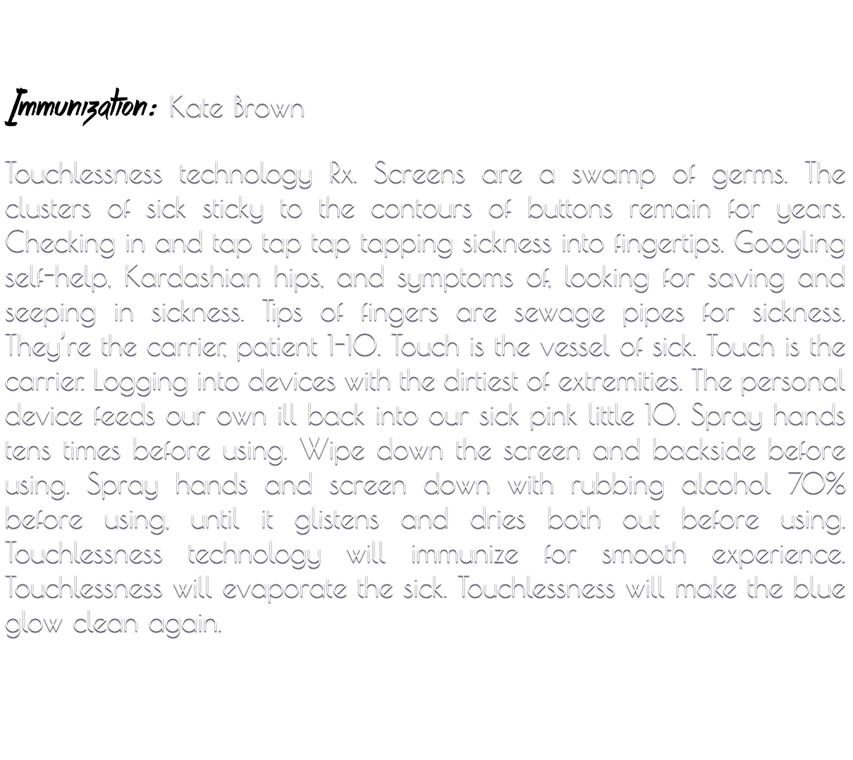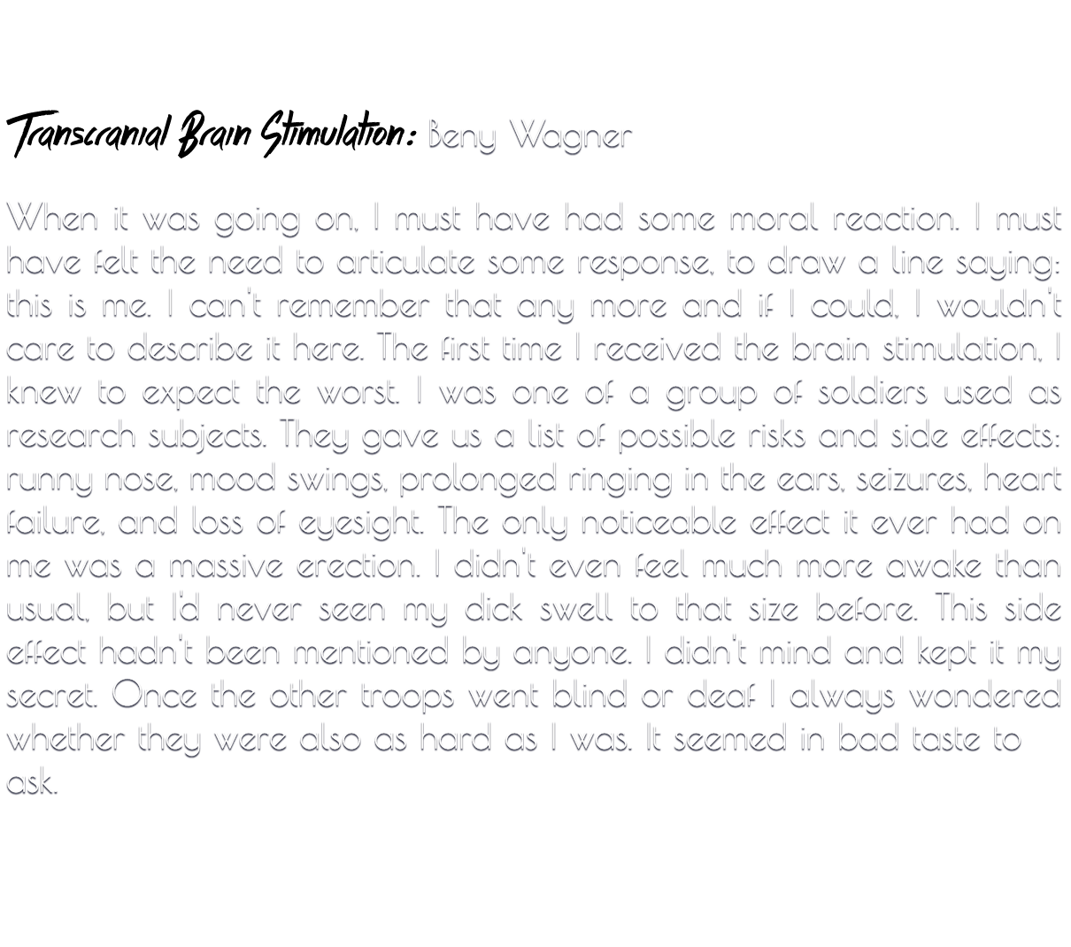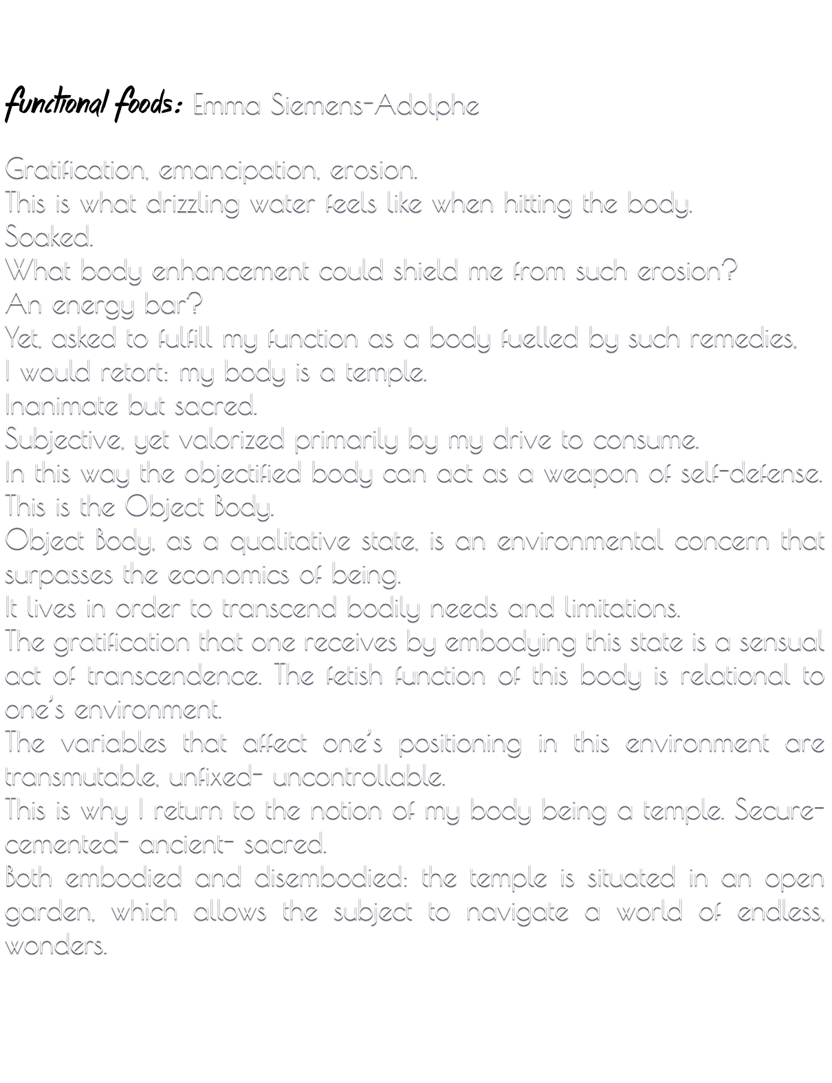 eStamina delves into the perceived possibilities of ‘human enhancement’ through technological means. The centrepiece of the show, a 60-minute ambient audio track accompanied by cg visuals in a drugged fog, involves scripted contributions from 26 others, including artists, musicians, curators and a neuroscientist. In compiling these varied accounts, a futuristic dreamscape emerges – a projection of anxieties and desires driven by the hyper-emotionalized and aestheticized ideals of the commercial sphere.