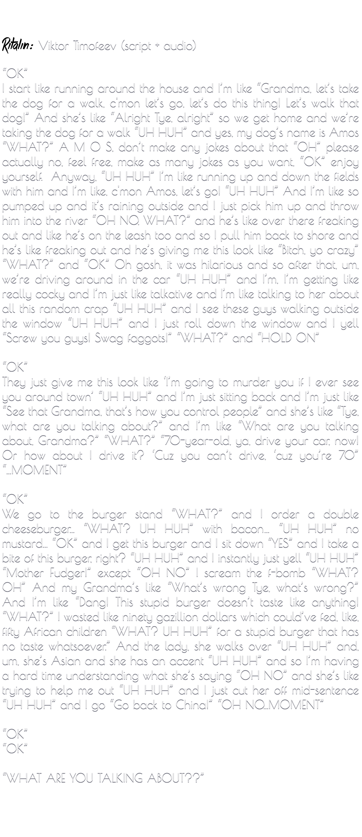 60-min digital animation & audio track, vinyl floor, seating, fog machine, caffeine & nicotine-infused fog juice, Redbull scent