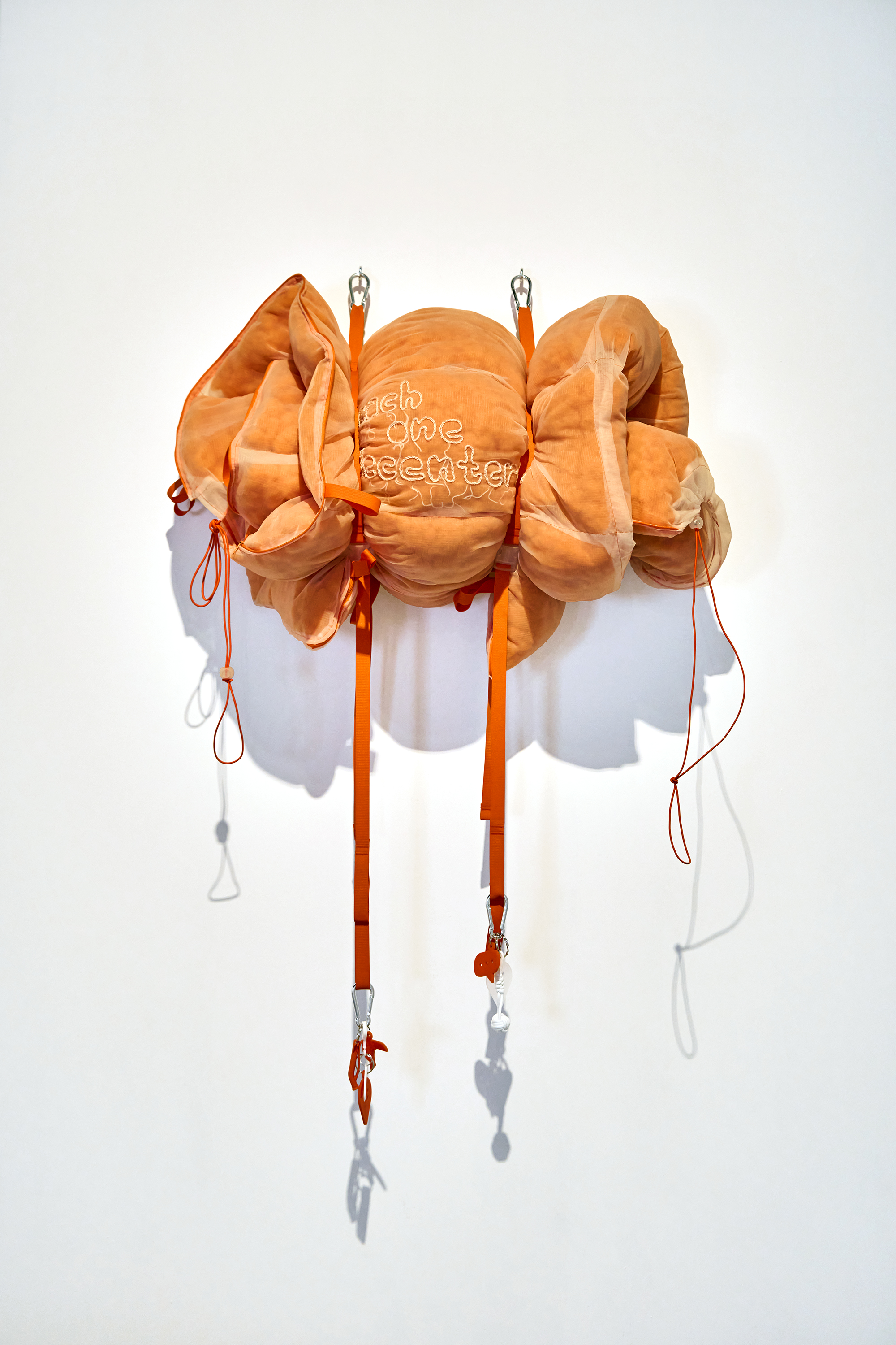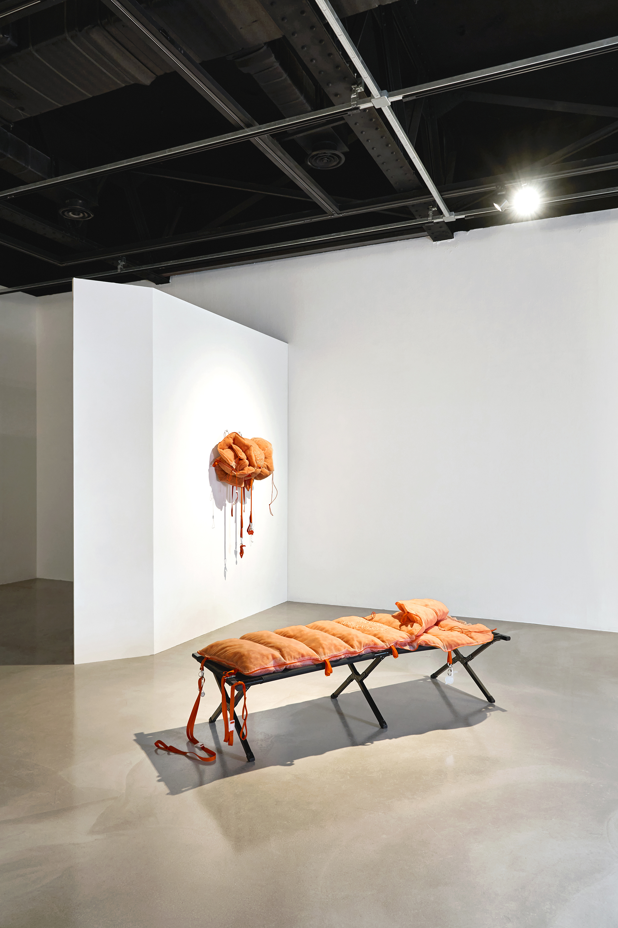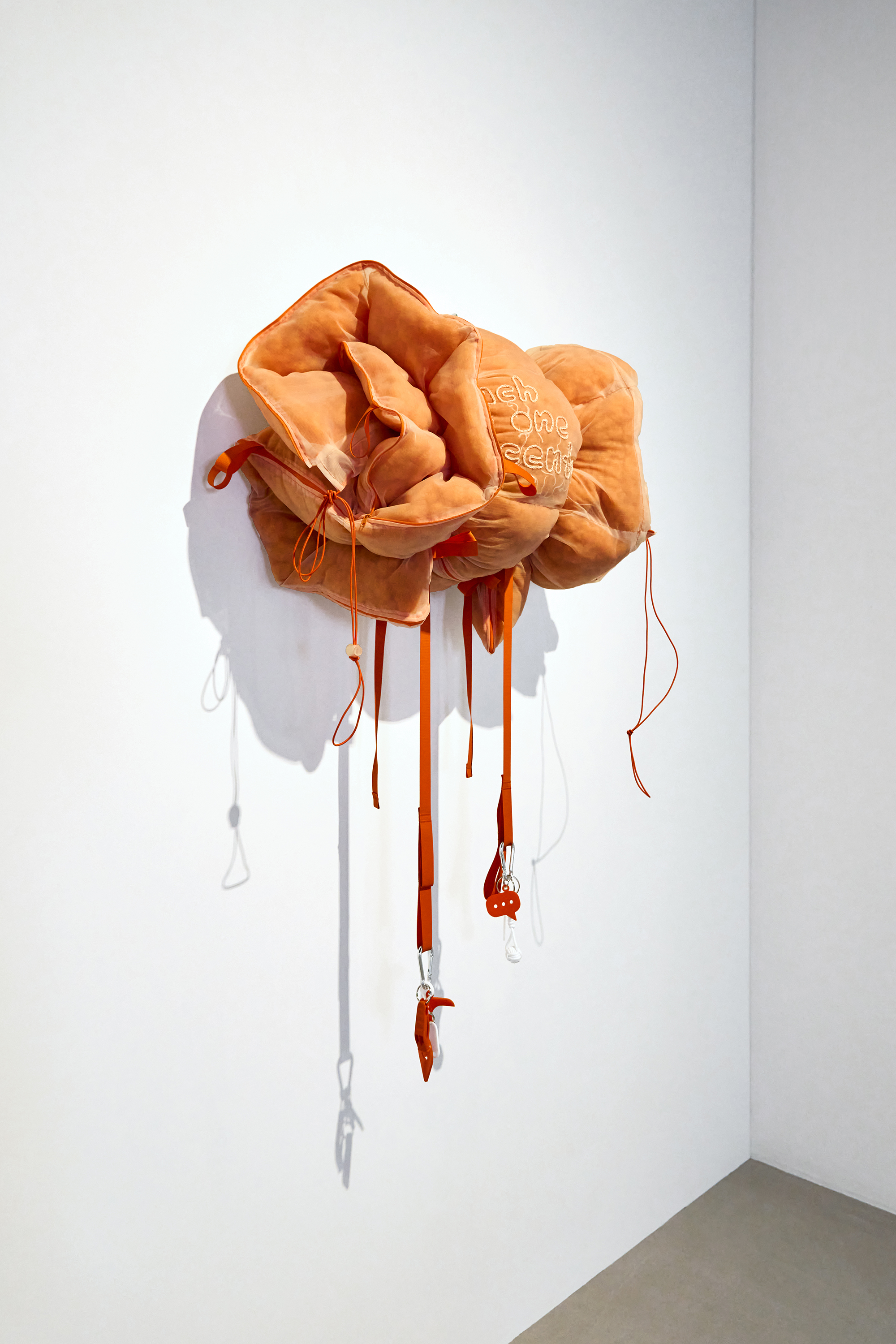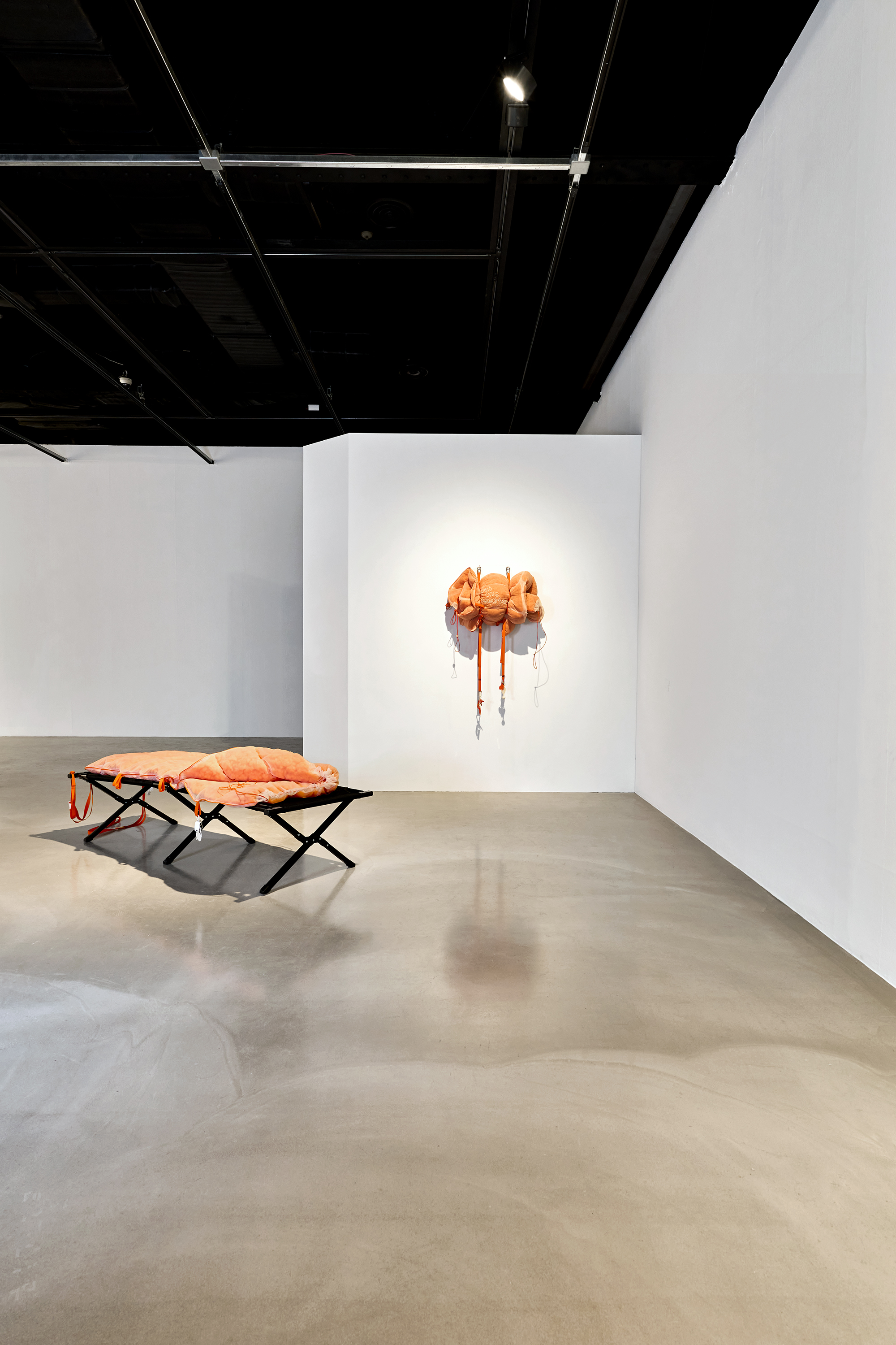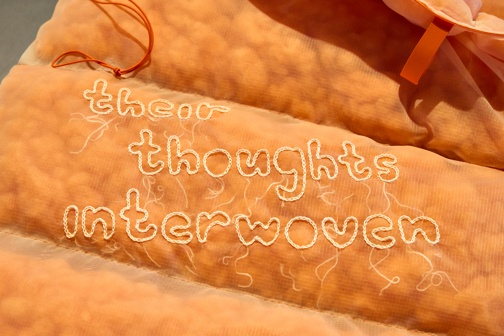 No Place Like Home was a group show, hosted by the Arts Council Korea, which included works by a selection of international artists who had previously participated in Korean residency programs. For this exhibition, Emmy Skensved presented a new piece, commissioned by the Arts Council Korea, entitled Social Fabric. Her installation consisted of two sleeping bags, constructed from translucent rip-stop nylon and embroidered with text. Skensved handcrafted the bags through a laborious process that involved tinting 2kg of polyester filling with synthetic dye so that the orange colour of the work emanates from within.