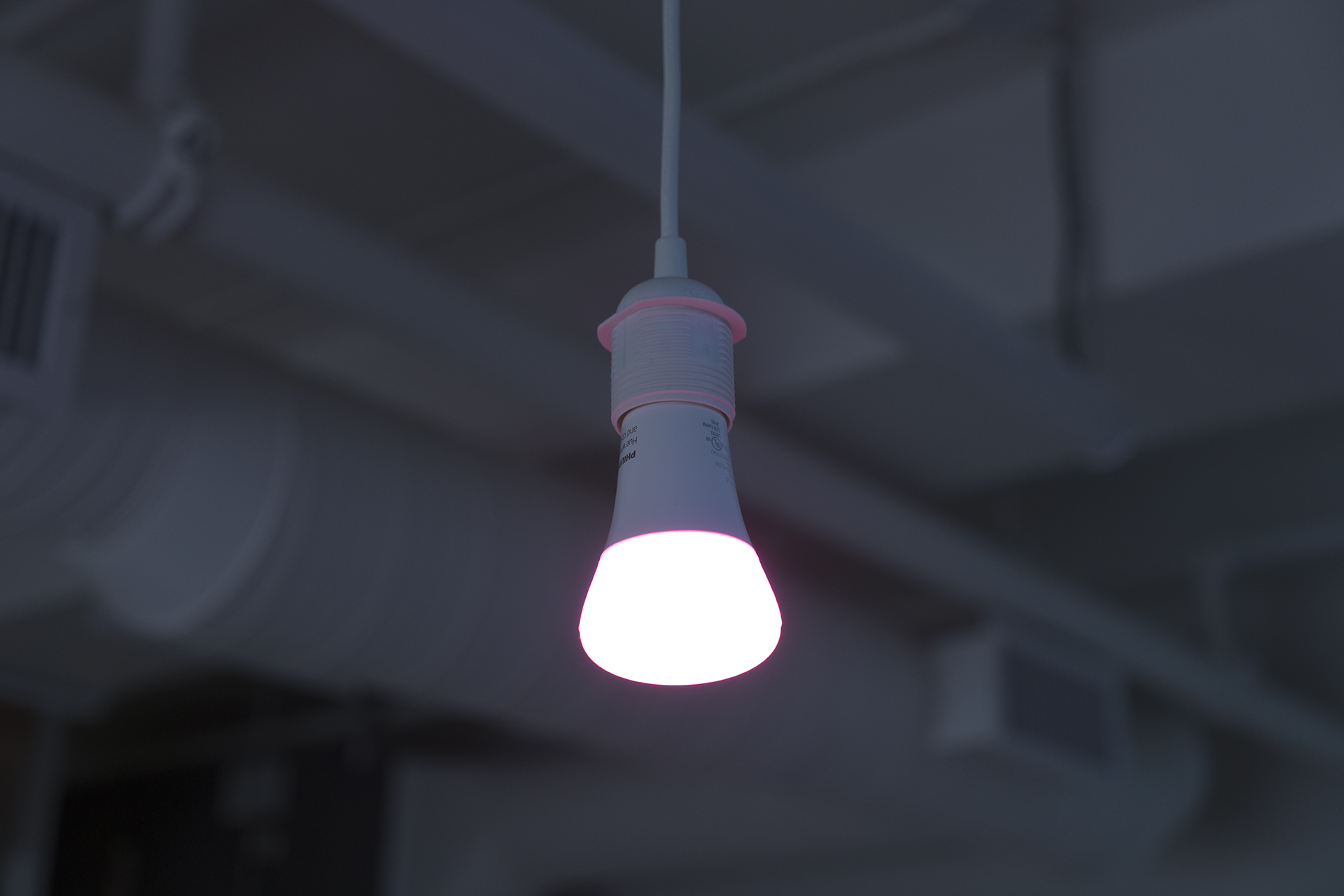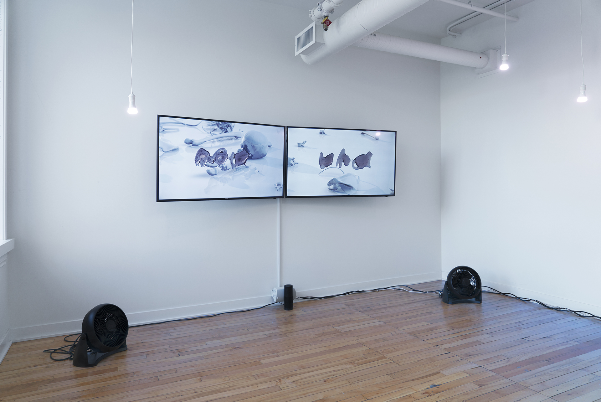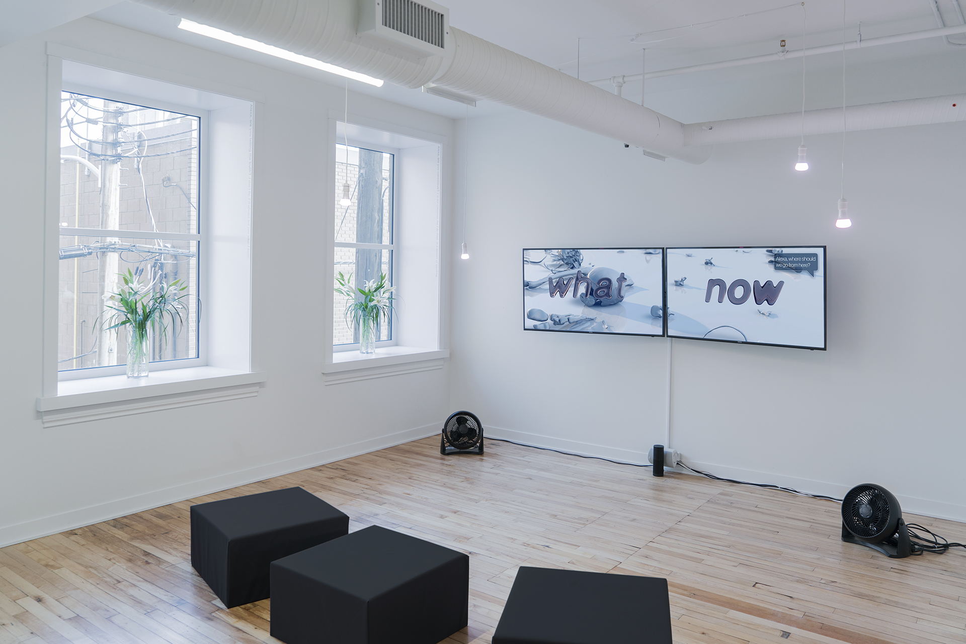 Yes, I’m here was a project by Emmy Skensved and Gregory Blunt probing the promises and perils of artificial intelligence, smart home technology, and the rising use of voice activated personal assistants, such as Amazon’s Alexa. Hosted off-site at the historic Bass Building in downtown Brandon, their multi-media installation contained a two-channel digitally-animated video, and an audio work that controlled elements within the exhibition space via voice commands.