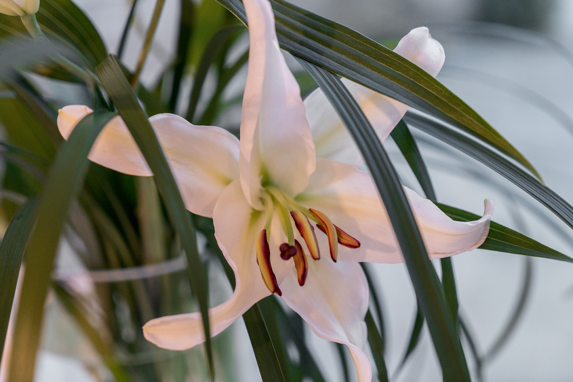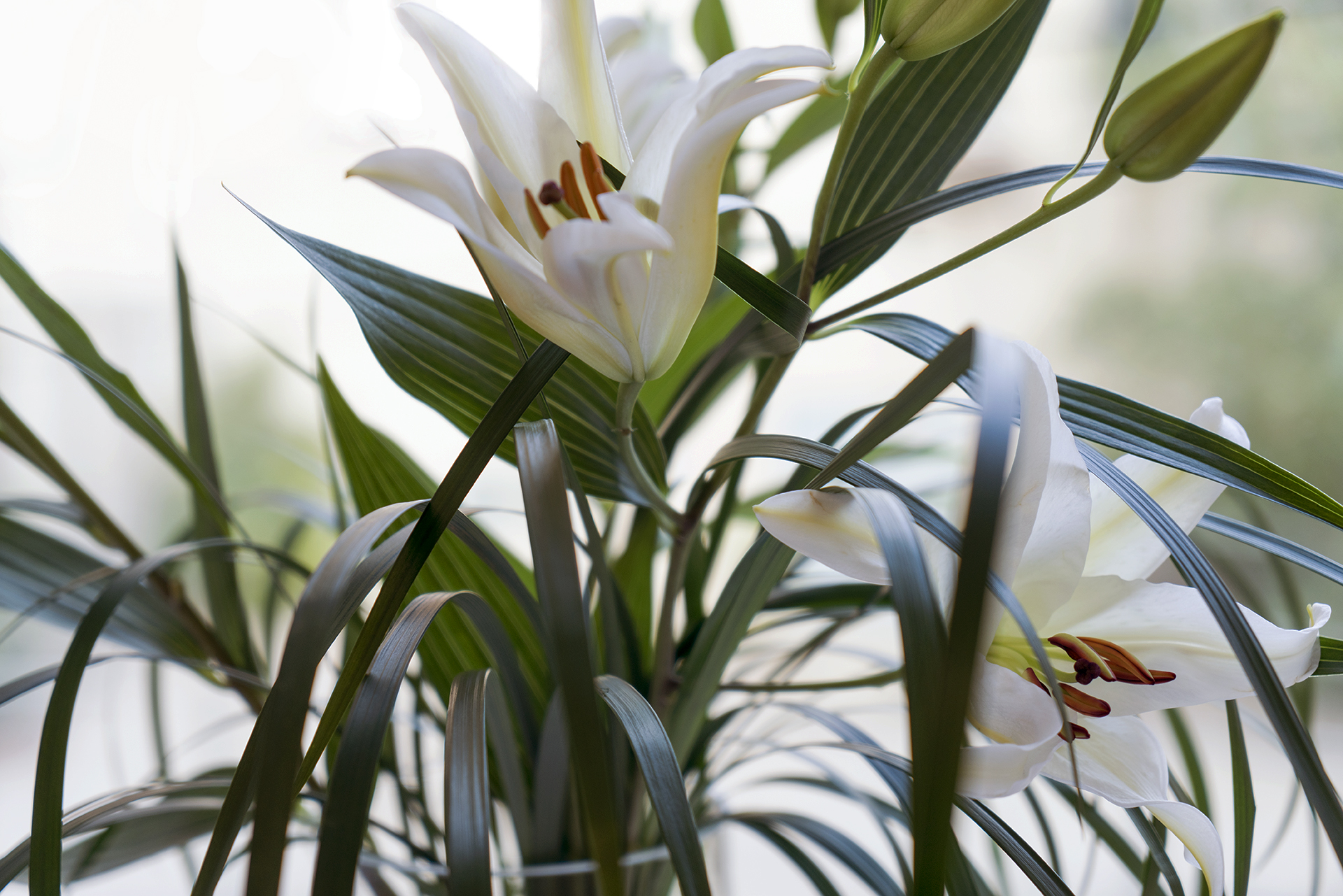Digital animation with audio, laser-cut vinyl lettering, seating, white lilies, Amazon Alexa, voice activated smart fans and light bulbs, AGSM, Brandon, CA, 2018.