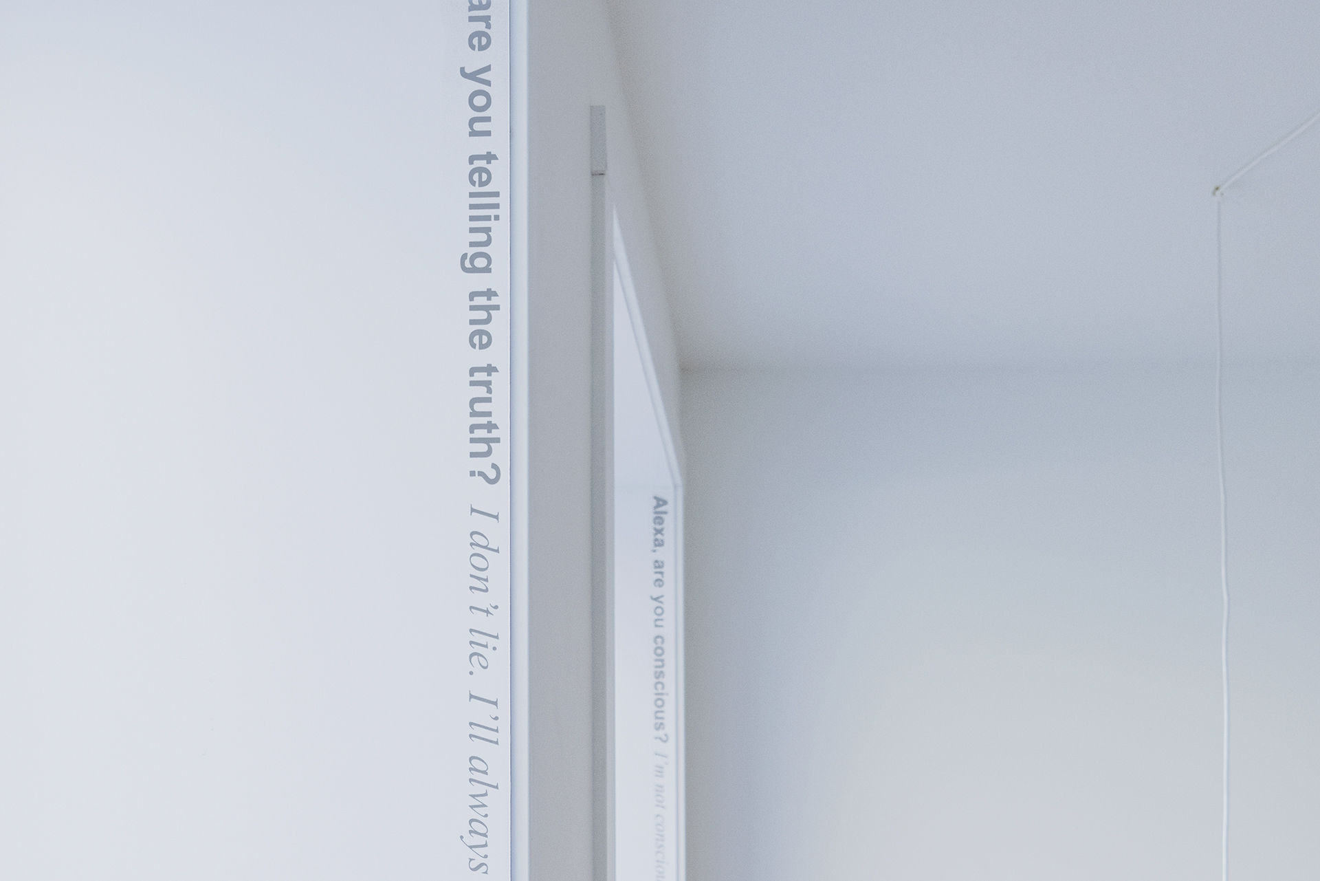 Featuring a speculative conversation between an individual and her voice activated personal assistant, the work touches upon themes of convenience, efficiency, and security. Blunt x Skensved examine how much these devices can learn from humans and whether they could eventually operate independently from their users. When one invites AI into the intimate space of one’s home, they are entering into a contract, relinquishing a certain degree of control and privacy in exchange for convenience; Blunt x Skensved cast a skeptical eye towards the level of transparency in this exchange, asking what the potential ramifications and outcomes of this increasingly invisible presence are.